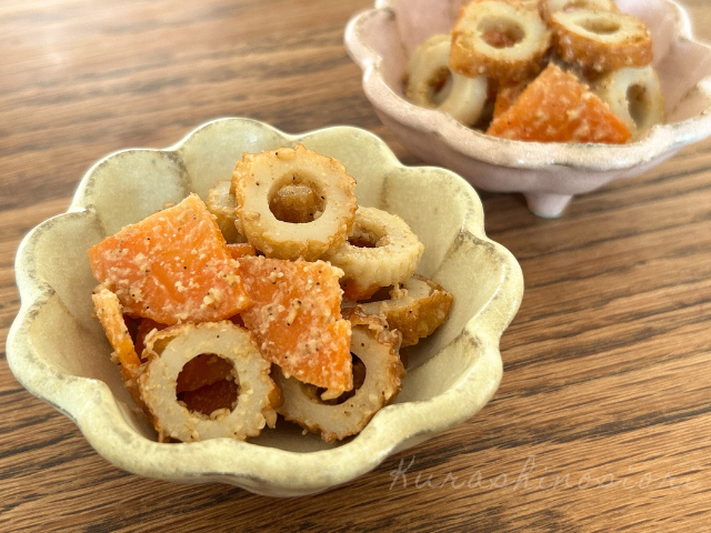 ①にんじん・れんこんは5mm幅程度の半月切りにする。