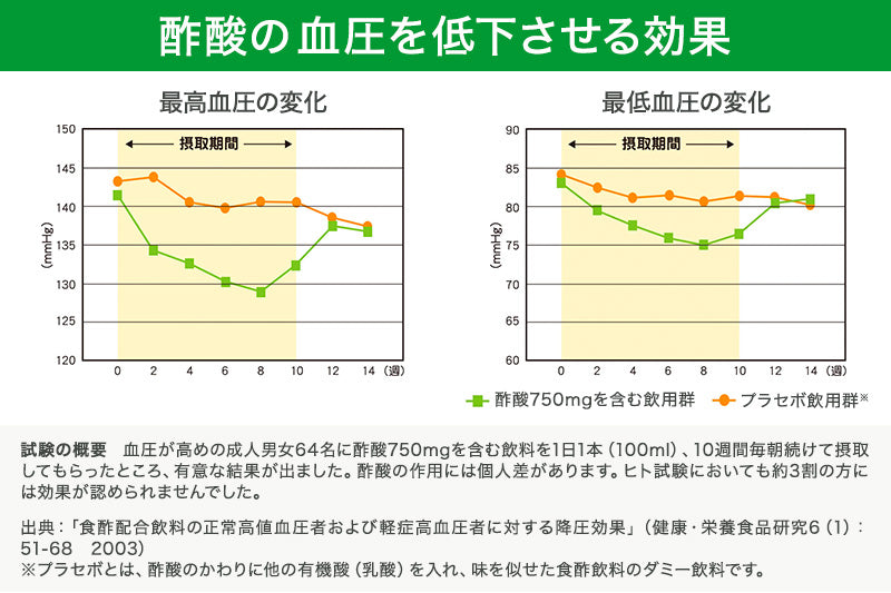 対象者を3群に分け、それぞれ酢酸750mgを含む飲料、1500mgを含む飲料、プラセボ飲料を1日1本8週間摂取させたところ、酢酸750mg含有飲料を摂取した群はプラセボ群に比較して摂取6週間後に収縮期血圧が低下した。また、酢酸1500mg含有飲料摂取群は、プラセボ群と比較して摂取4週間後に収縮期および拡張期血圧が低下した。