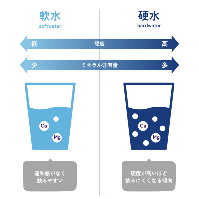 硬度とは、水1Lの中に含まれるカルシウムイオンやマグネシウムイオンの量を換算したものです。つまり、カルシウムやマグネシウムを豊富に含むミネラルウォーターほど硬度が高いということですね。