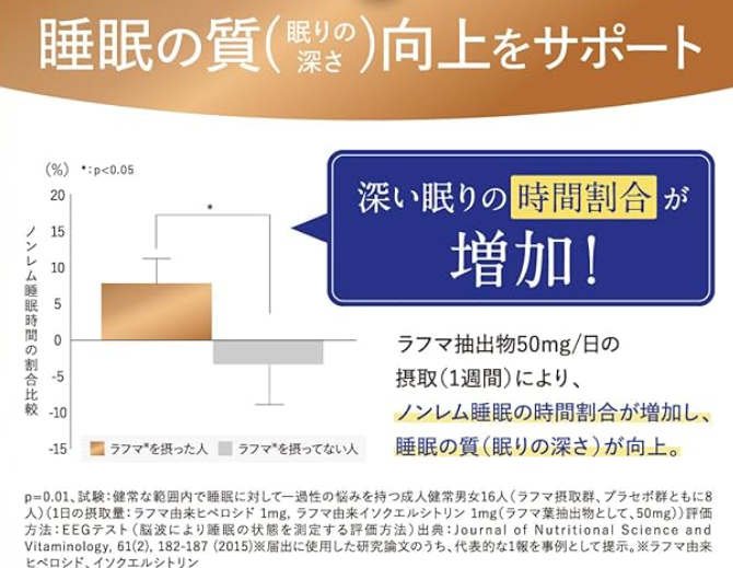ラフマ抽出物を摂取すると夜間のメラトニン分泌が増え、スムーズに入眠でき、眠りの質が高まる効果が期待できます。